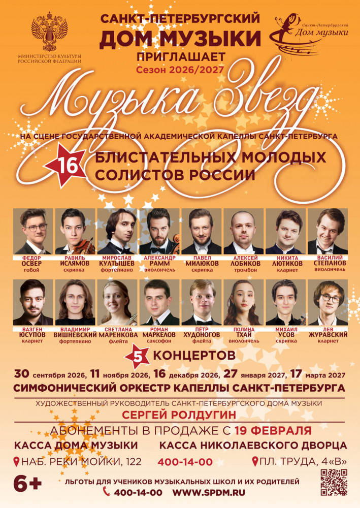 This is a cycle performances of the young Russian stars, being the soloists of the Saint-Petersburg Music House and Moscow State Philharmonic at the stage of the Saint-Petersburg State Academic Capella and in the Skryabin Hall of the North-Caucasian State Philharmonic n.a. Safonov (Kislovodsk). Annually, a separate series of 5 concerts take place at each music venue including performances of 10 outstanding young Russian soloists accompanied by the orchestra.